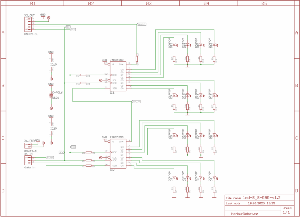 Uspořádání je takové, že každý hc595 ovládá 2×4 ledky. Jsou tedy v sérii.